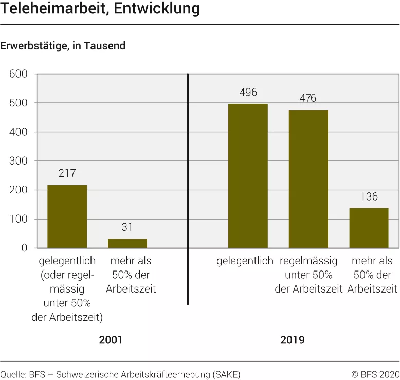 Laut einer kürzlich von Colombus Consulting durchgeführten Umfrage wünschen sich fast 80% der Schweizerinnen und Schweizer, in Zukunft vermehrt von zu Hause aus arbeiten zu können, weil 70% von ihnen diese Variante effizient finden. Es stimmt, dass es sich ursprünglich um eine Empfehlung handelte, die schliesslich fast über Nacht von einer Vielzahl von professionellen Strukturen übernommen wurde. Viele Beschäftigte entdecken jetzt in unterschiedlichem Masse die Vorteile, die Teleheimarbeit bieten kann. Da uns bisher die äusseren Umstände nicht dazu gezwungen haben, erfordert die Möglichkeit, von zu Hause aus zu arbeiten, sowohl für Arbeitnehmer als auch für Arbeitgeber einige Anpassungen. Wie die unten stehende Grafik zeigt, begann die Umstellung auf ein eher nomadisches Arbeitsleben jedoch nicht erst mit der COVID19-Krise und war bereits ein deutlich nachweisbarer Trend: