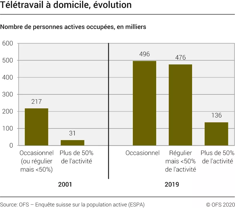 Selon un sondage récent réalisé par Colombus Consulting, à l’avenir, près de 80% des Suisses désirent pouvoir travailler de plus en plus depuis leur habitation car 70% d’entre eux trouvent que cette option est efficace. Il est vrai que cette mesure qui, à la base était une recommandation, a finalement été adoptée pratiquement du jour au lendemain par un grand nombre de structures professionnelles. Désormais, de nombreux collaborateurs découvrent, avec plus ou moins de résilience, les avantages que peut apporter le home office. Lorsque nous n’en avons pas forcément l’habitude, pouvoir travailler depuis son lieu de résidence nécessite quelques ajustements, tant pour les employés que les employeurs. Néanmoins, comme le démontre ce graphique ci-dessous, ce besoin d’adaptation à un mode de travail plus nomade ne date pas de la crise du COVID-19 et représentait déjà une tendance aisément démontrable :