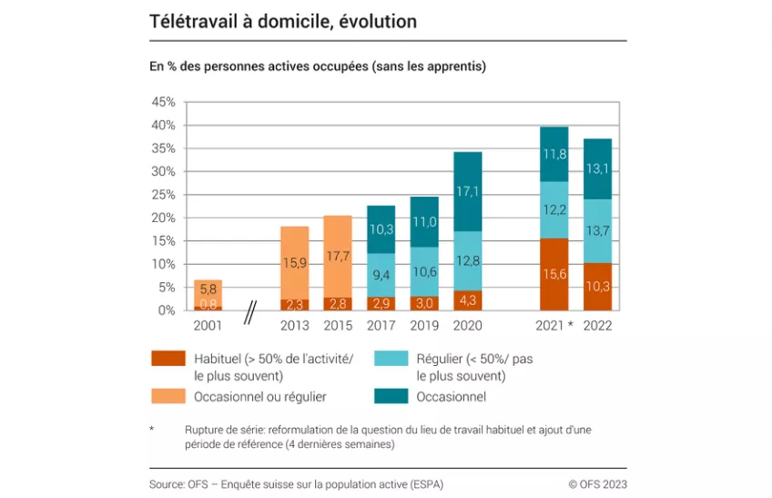 En seulement vingt ans, le télétravail à domicile a considérablement gagné en popularité, touchant jusqu'à un quart de la population active occupée avant la pandémie. De 2001 à 2019, sa prévalence est passée de 6,6% à 24,6%. Avec la crise du Covid-19 en 2020, ce chiffre a grimpé à 34,1%, représentant ainsi 1,5 million de personnes en Suisse. En 2022, cette proportion atteint 37,1%, montrant une évolution significative dans les pratiques professionnelles.